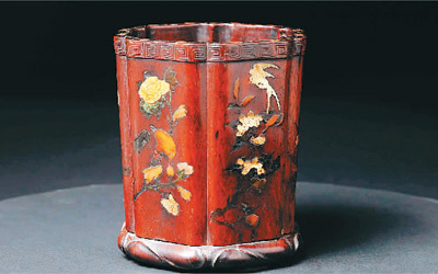 中国文房艺术展展品明黄花梨百宝嵌笔筒。
