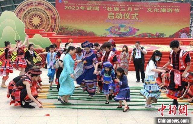 在壮文化发源地之一——南宁市武鸣区,来自广西各地的山歌王、民间歌手齐聚一堂、同台竞歌,壮乡小学生们用新唱法演绎经典山歌;抢花炮、跳竹竿舞、抛绣球、打陀螺、品美食……众多游客慕名前来体验“壮族三月三”文化旅游节魅力。