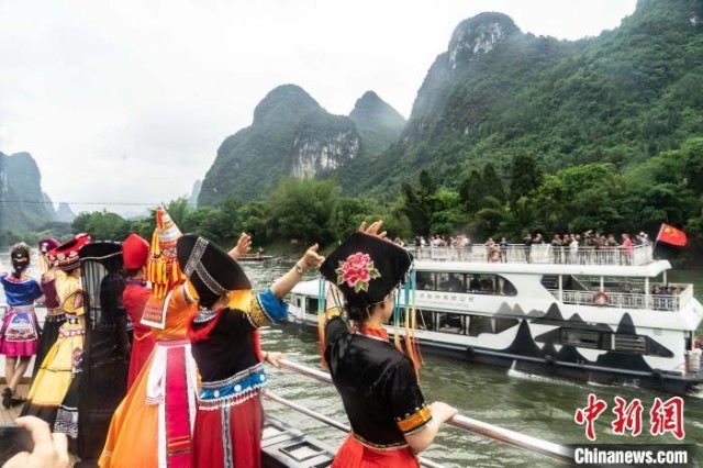 在美丽的桂林漓江,一场以“潮歌三月三·山歌满漓江”为主题的山水实景对歌会精彩上演,身着民族服饰的演员们乘坐游船,沿江而下一路“嗨”歌,与游客互动,展现广西山水之美和山歌之韵。