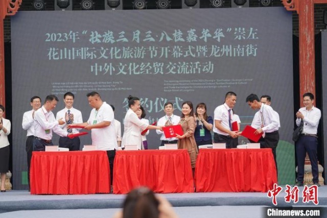 在中越边城广西崇左市,中外传统服饰大赛、中越山歌大会、国际青年联谊相亲大会等特色活动相继举办,越方代表团专程从龙州水口口岸过关,参加崇左花山国际文化旅游节,感受壮族“三月三”民俗风情的魅力。