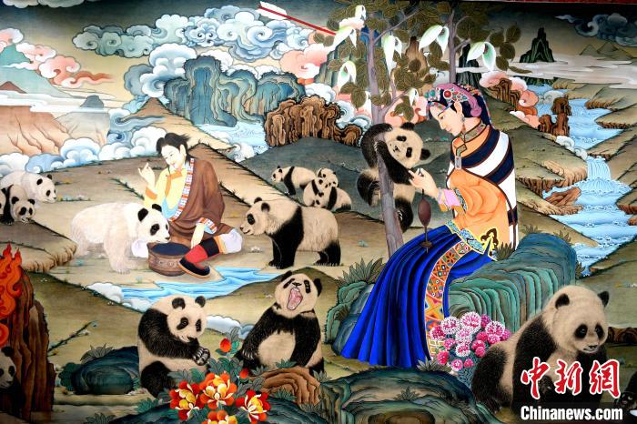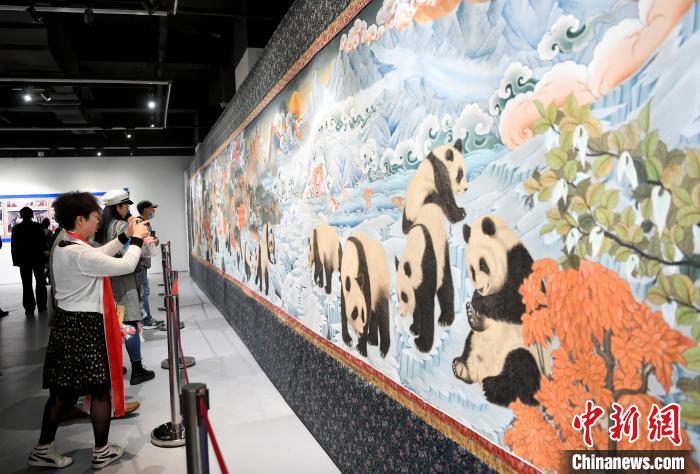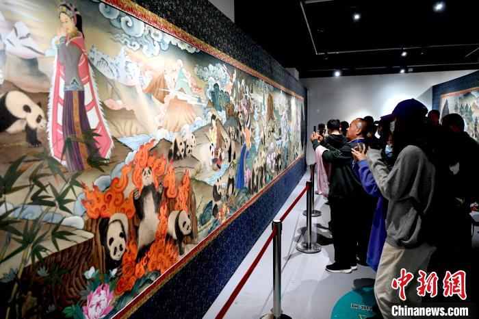中新网成都10月11日电 (记者 安源)由四川省阿坝州文化体育和旅游局策划、40多名阿坝州唐卡大师历经一年创作完成的全球唯一的大熊猫巨幅唐卡——《大熊猫百图唐卡长卷》于11日在四川省图书馆首次亮相,来自各地的观众在此享受了一场“熊猫家园净土阿坝”的艺术视觉盛宴。