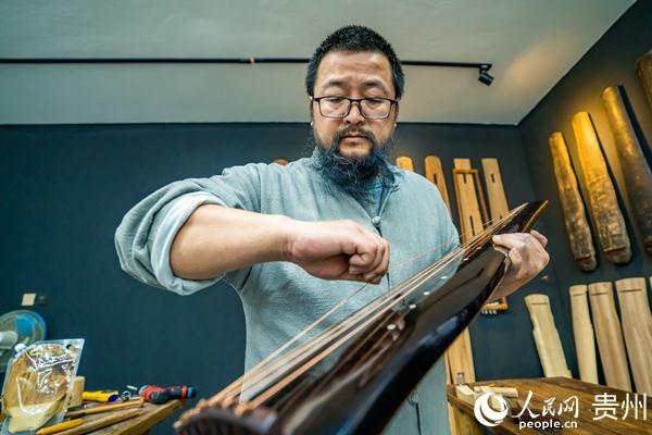 王兵为古琴成品上弦。人民网 涂敏摄