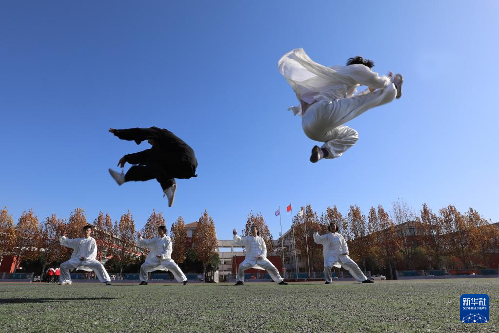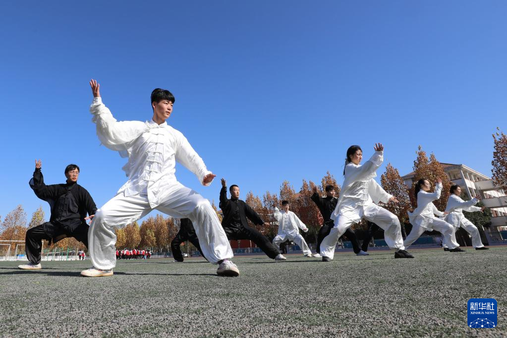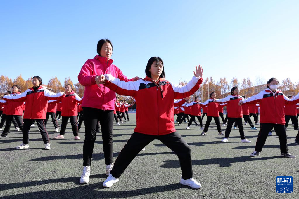 11月23日,焦作市温县一中学生在老师指导下习练太极拳。近年来,河南省焦作市温县立足太极拳发源地的资源优势,将太极拳列入中小学体育课必修内容,定期开展师生太极拳比赛交流活动,传承弘扬太极文化。新华社发(徐宏星 摄)